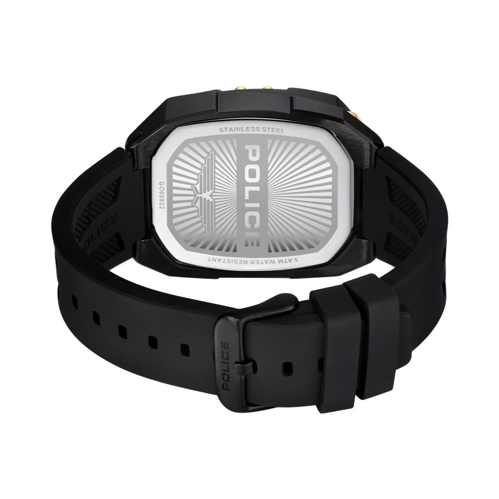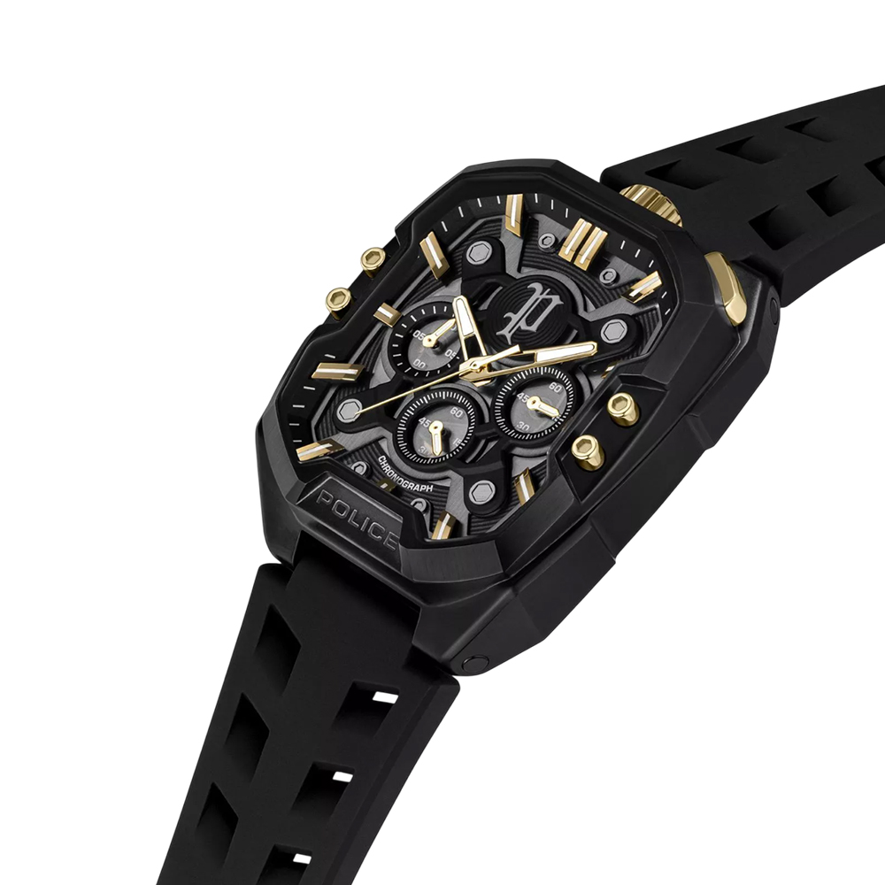 The Police Bullhead PEWGO0092204 watch is a striking men's chronograph timepiece featuring a durable stainless steel tonneau-shaped case in black. Its black Leather strap combined with a secure buckle closure offers comfort and style. The watch is powered by a precise quartz movement, protected with mineral glass, making it suitable for everyday wear with 5 ATM water resistance, able to withstand washing and showering. This contemporary design blends sporty toughness with refined craftsmanship, perfect for men seeking a bold accessory that stands out in urban fashion.
