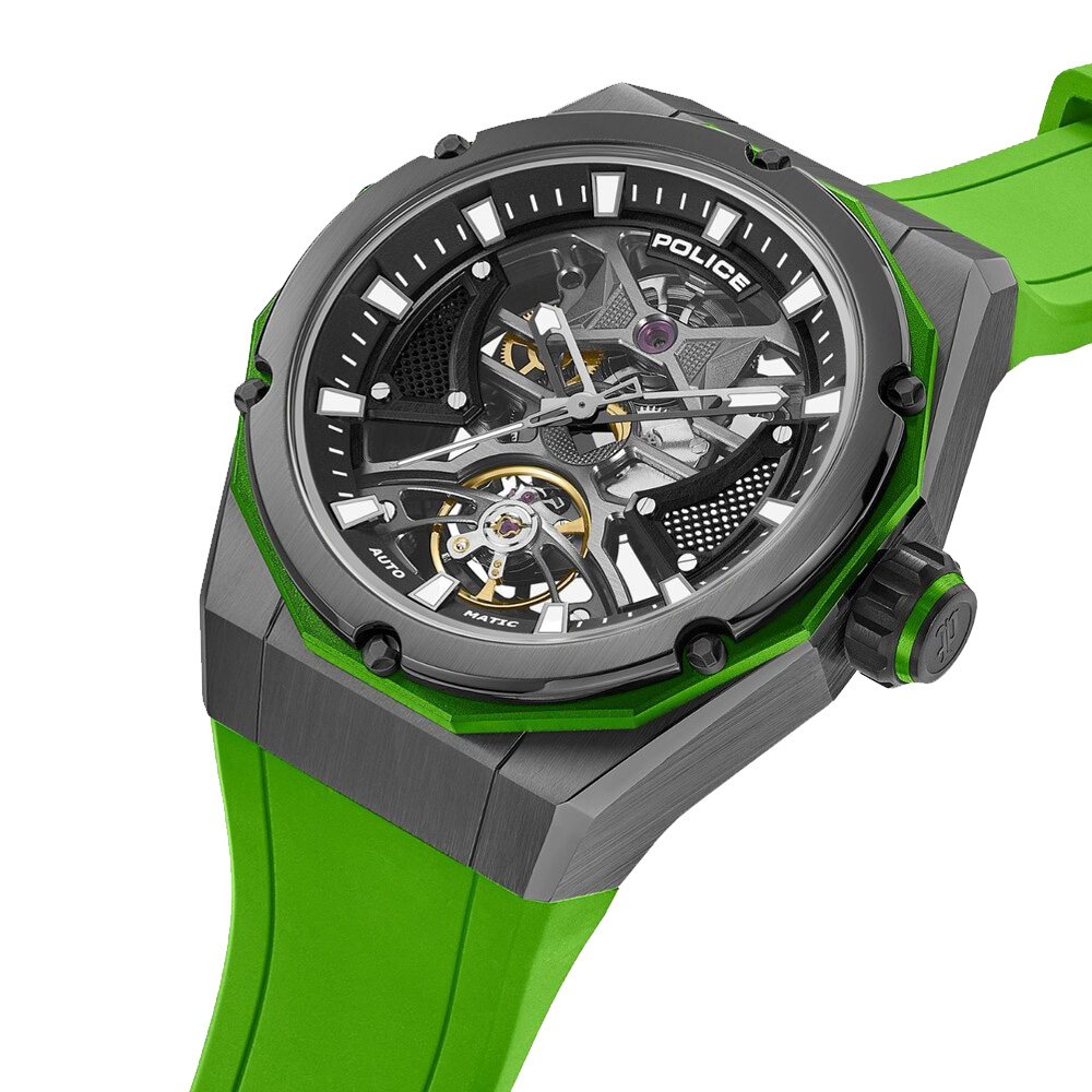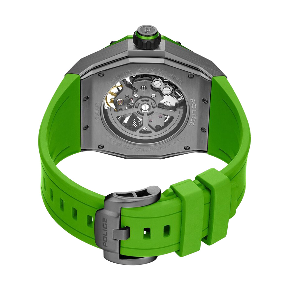 The POLICE Dayton men’s watch PEWGR0082303 is crafted for individuals who appreciate bold styling combined with mechanical performance. The deep black dial enhances readability while maintaining a sleek and modern look, creating a strong contrast against the vibrant green rubber strap. Encased in a robust 46 mm case, the watch delivers a commanding wrist presence suited for both casual and sporty wear. The durable rubber strap ensures flexibility, comfort, and long-lasting wear, making it ideal for active lifestyles. Protected by mineral glass, the dial resists everyday scratches and maintains clarity over time. Powered by automatic movement, it eliminates the need for batteries while showcasing reliable mechanical operation. With 5 ATM water resistance, the watch is suitable for daily use and protected against splashes and light moisture exposure. A perfect combination of bold color contrast, durability, and modern design.