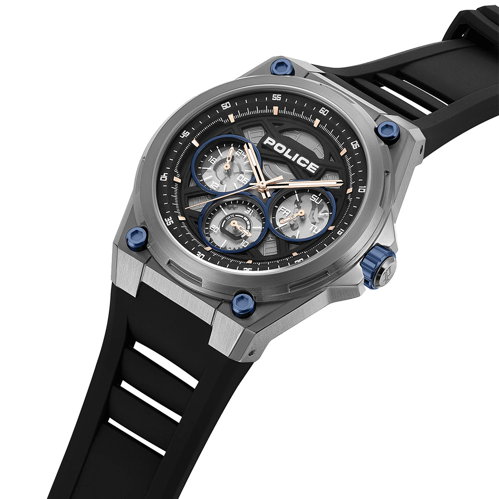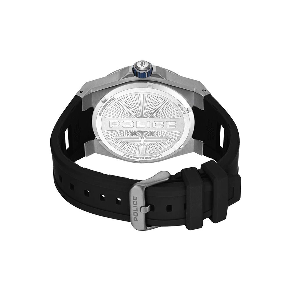 The POLICE Dominion men’s watch PEWGQ0093803 is crafted for individuals who appreciate strong design and commanding presence. Featuring a deep black dial enhanced with stainless steel indexes, this timepiece delivers a clean yet bold visual contrast. The 45 x 50.5 mm stainless steel case, finished with ion-plated black detailing, creates a robust and industrial-inspired look that stands out on the wrist. Designed with multifunction capabilities, the watch offers practical utility while maintaining a sleek and controlled layout. The blue silicone strap adds a sporty and energetic touch while ensuring flexibility, durability, and long-lasting comfort. Protected by mineral glass, the dial resists everyday scratches and maintains clarity. Powered by reliable quartz movement, it ensures accurate and consistent timekeeping. With 5 ATM water resistance, the watch is suitable for daily use and resistant to splashes and light moisture exposure. A perfect blend of bold aesthetics, durability, and modern functionality.