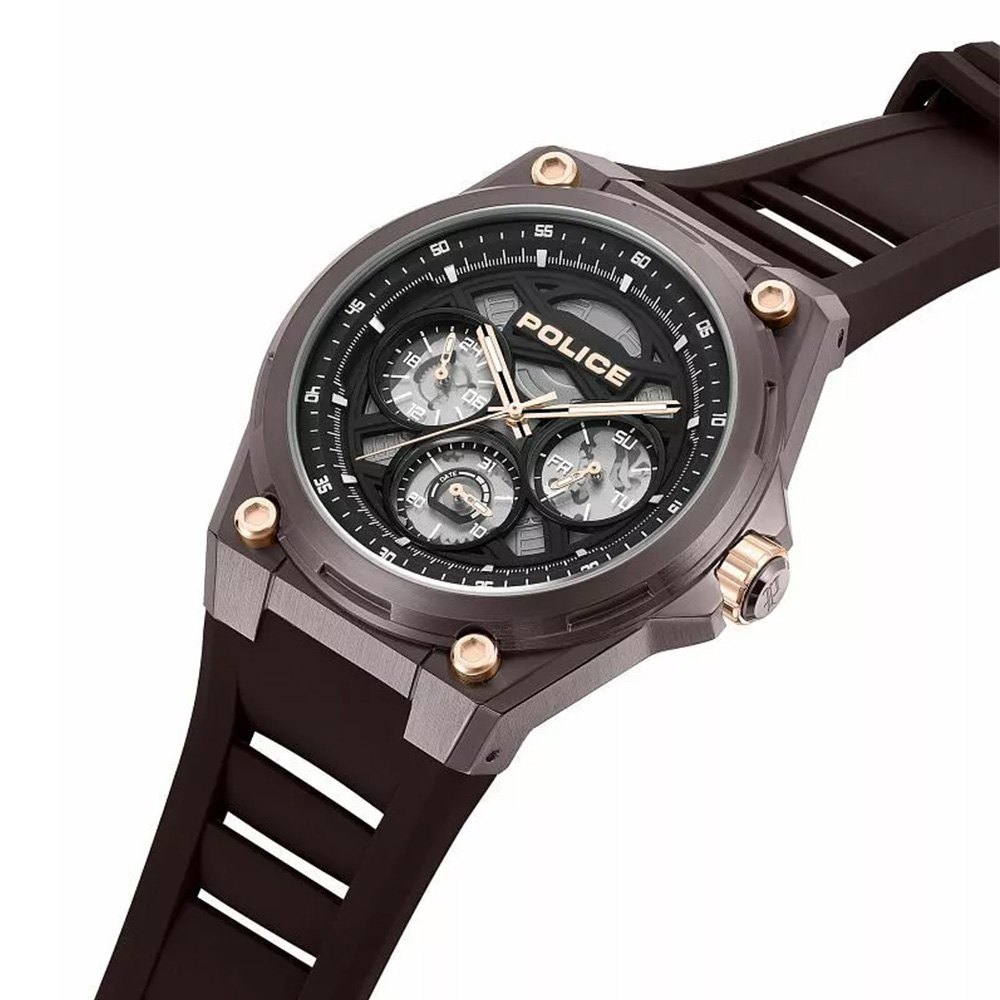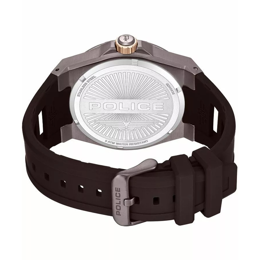 The POLICE Dominion men’s watch PEWGQ0093801 is crafted for individuals who appreciate bold styling with a unique color combination. Featuring a deep black dial paired with a brown-toned stainless steel case, this timepiece offers a distinctive and modern visual appeal. The 45 mm case showcases polished and brushed finishes, enhancing its rugged yet refined character. The brown silicone strap ensures flexibility, durability, and all-day comfort, making it suitable for active lifestyles. Protected by mineral glass, the dial resists everyday scratches while maintaining clarity. Powered by reliable quartz movement VX7J, the watch ensures accurate and consistent timekeeping. With 5 ATM water resistance, it is suitable for daily wear and resistant to splashes, rain, and light water exposure. A perfect combination of bold design, comfort, and modern functionality.