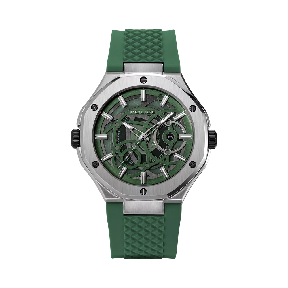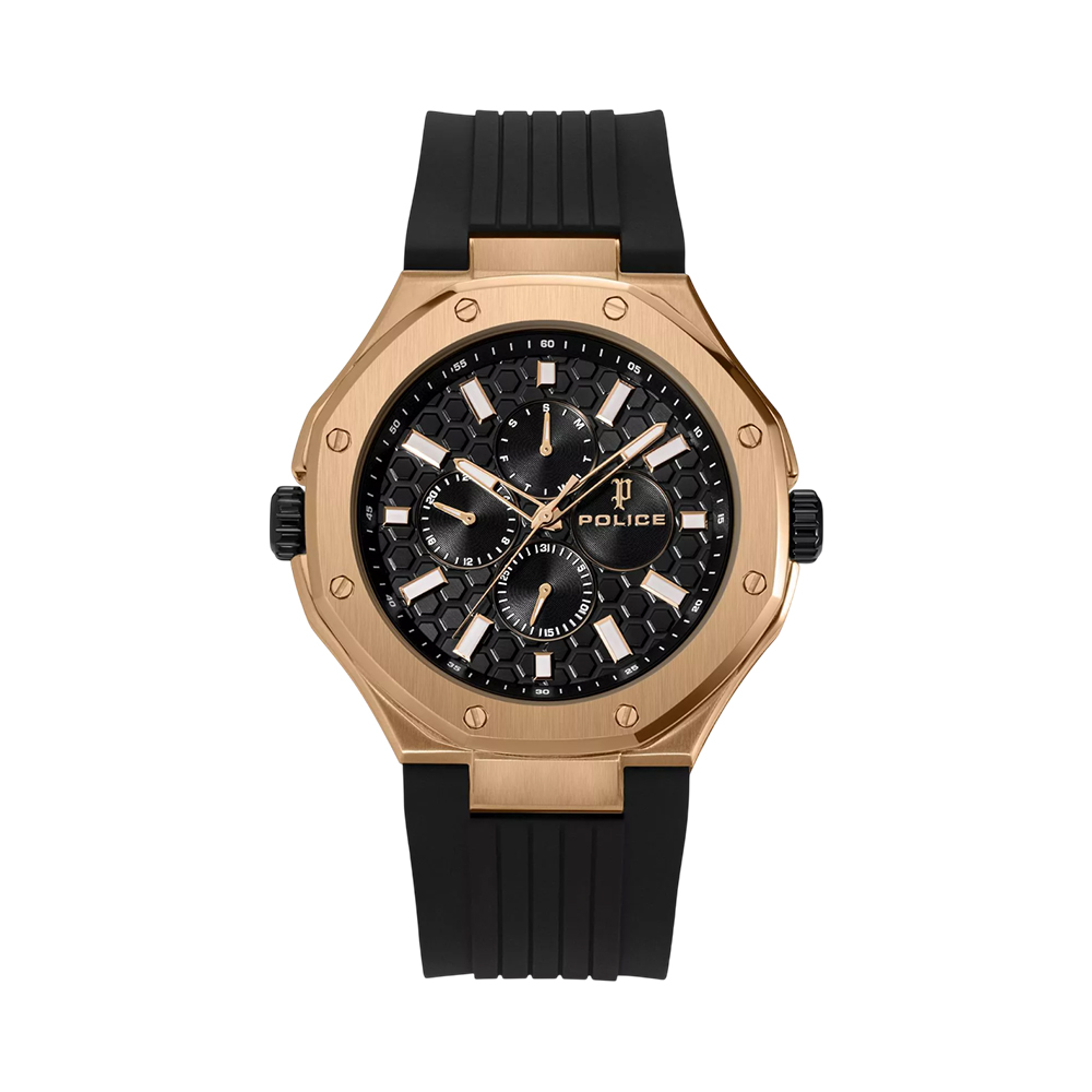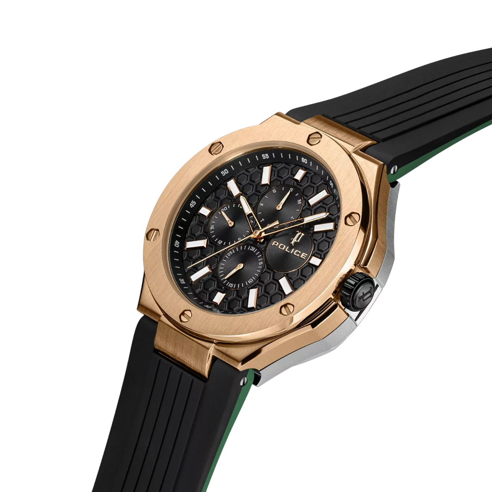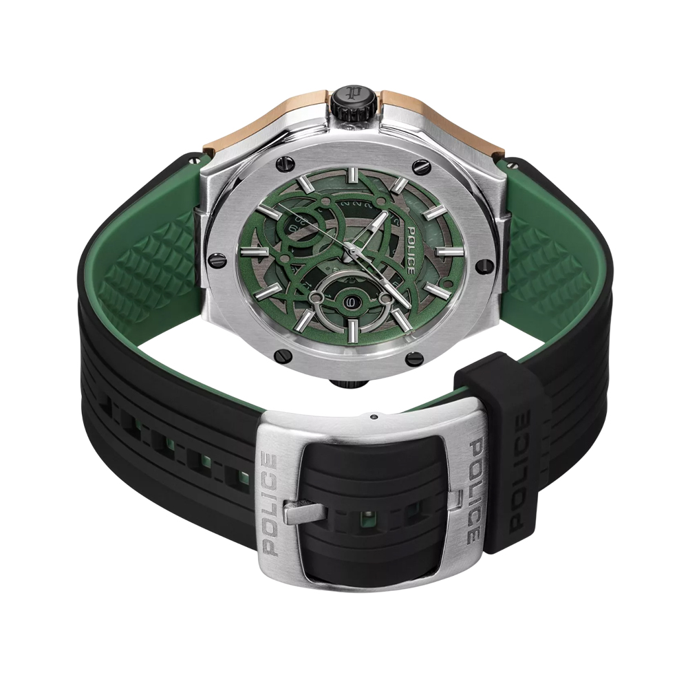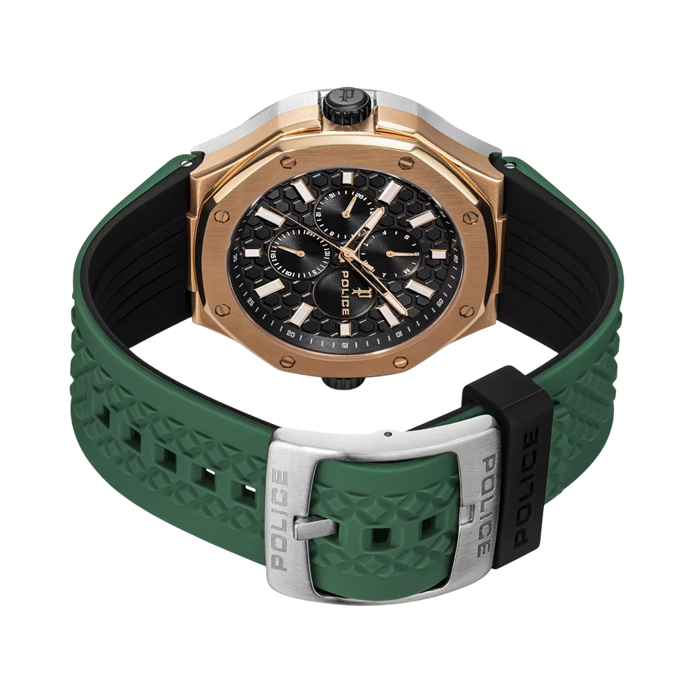 The POLICE Dual Watch PEWGQ0081902 is a versatile masterpiece, offering a unique reversible design that provides two distinct looks in one timepiece. The 44 mm stainless steel case and silicone strap can be twisted to alternate between a silver/black aesthetic and a rose-gold/green style. One side features a sleek black dial with a date window, while the other side showcases a grey-green dial with triple sub-dials for day, date, and 24-hour time. Powered by a high-precision VX9N quartz movement and protected by mineral glass, this 5 ATM water-resistant watch is the ultimate accessory for the modern man who values innovation and variety.