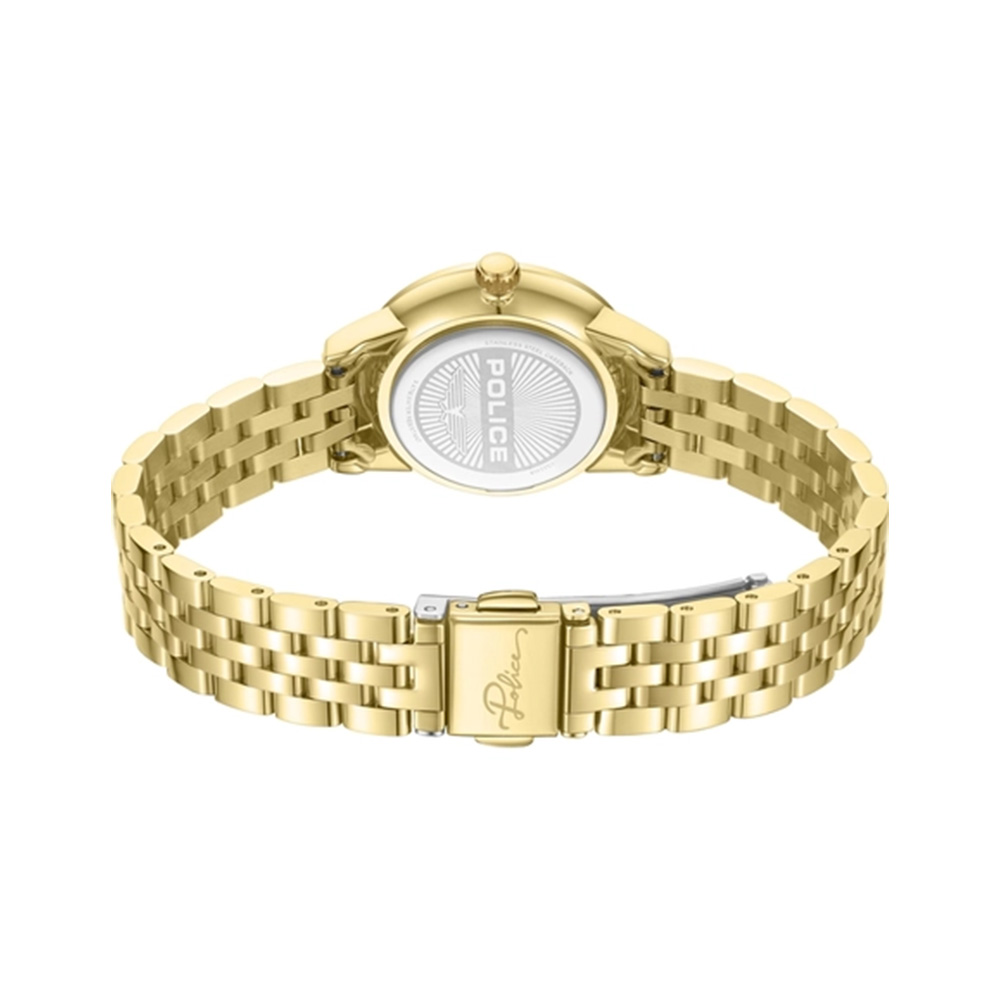 The POLICE women’s analog watch PEWLG2240803 is crafted for those who appreciate bold elegance with a refined finish. Featuring a deep green dial, this timepiece offers a striking yet balanced aesthetic that enhances both casual and formal outfits. The 30 mm gold-toned case adds a luxurious touch, perfectly complemented by a matching metal bracelet that ensures a cohesive and polished appearance. Designed for comfort and durability, the foldable clasp provides a secure and seamless fit for daily wear. The dial is protected by flat mineral glass, offering resistance against everyday scratches while maintaining clarity. Powered by reliable quartz movement, the watch ensures precise and consistent timekeeping. With 3 ATM water resistance, it is suitable for everyday use and resistant to minor splashes such as handwashing or light rain. A perfect blend of elegance, durability, and modern feminine style.