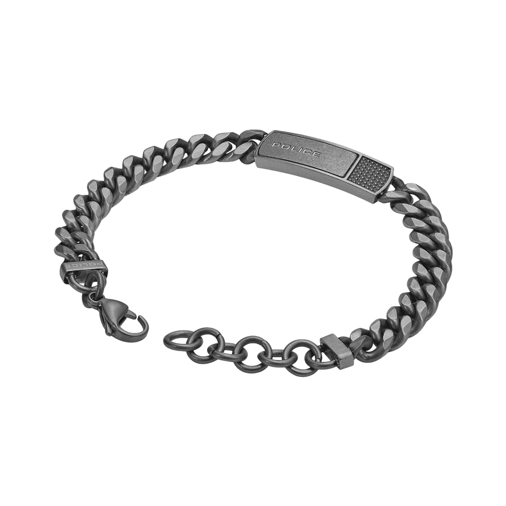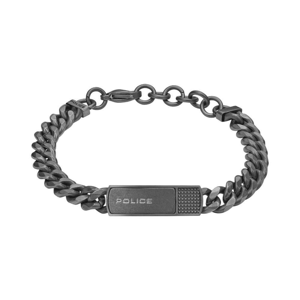 Audacious yet refined, the POLICE Identity bracelet in IP gun captures the raw edge of the brand. Its bold gauge links make a powerful statement, while the brushed and antique centre charm, etched with the POLICE logo and featuring a textured studded design adds just the right amount of rebellious character.