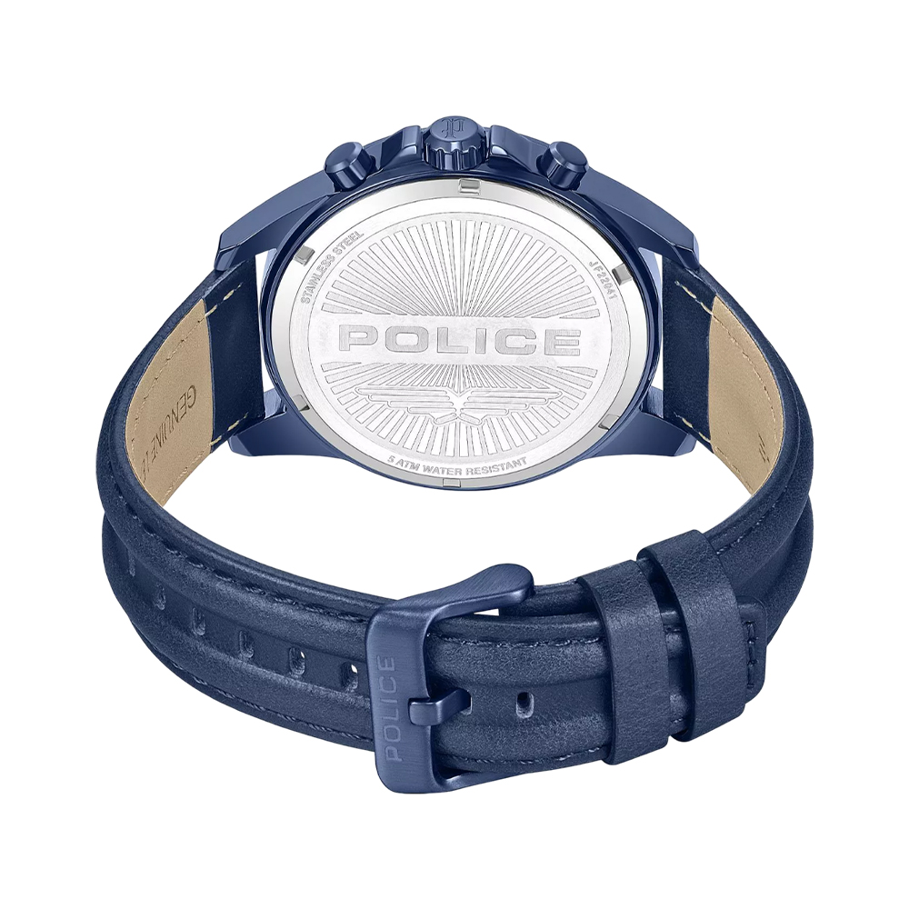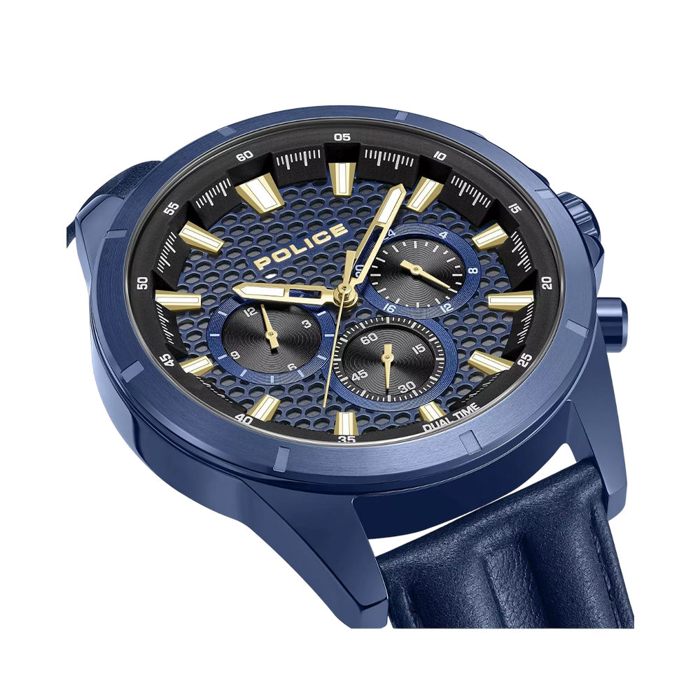Embrace bold, modern style with the Police Malawi watch, a multi-functional timepiece designed for the man who dares to be different. The ion-plated blue stainless steel case frames a vibrant blue honeycomb dial packed with the energy of a true multifunction layout. This watch features chronograph and dual-time functionality, all powered by a reliable VX9J quartz movement and protected by a durable mineral glass. Rose gold-tone indices slash through the textured dial, delivering high-contrast with attitude, while the matching ion-plated blue top ring completes the look. The watch is anchored by a blue leather strap that is both stylish and secure for everyday wear. Water-resistant up to 50 meters, this timepiece combines practicality with an uncompromised aesthetic.