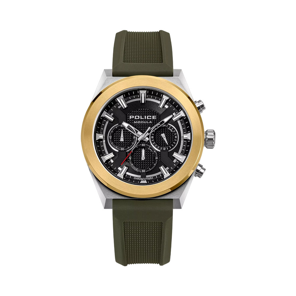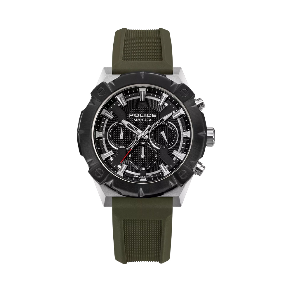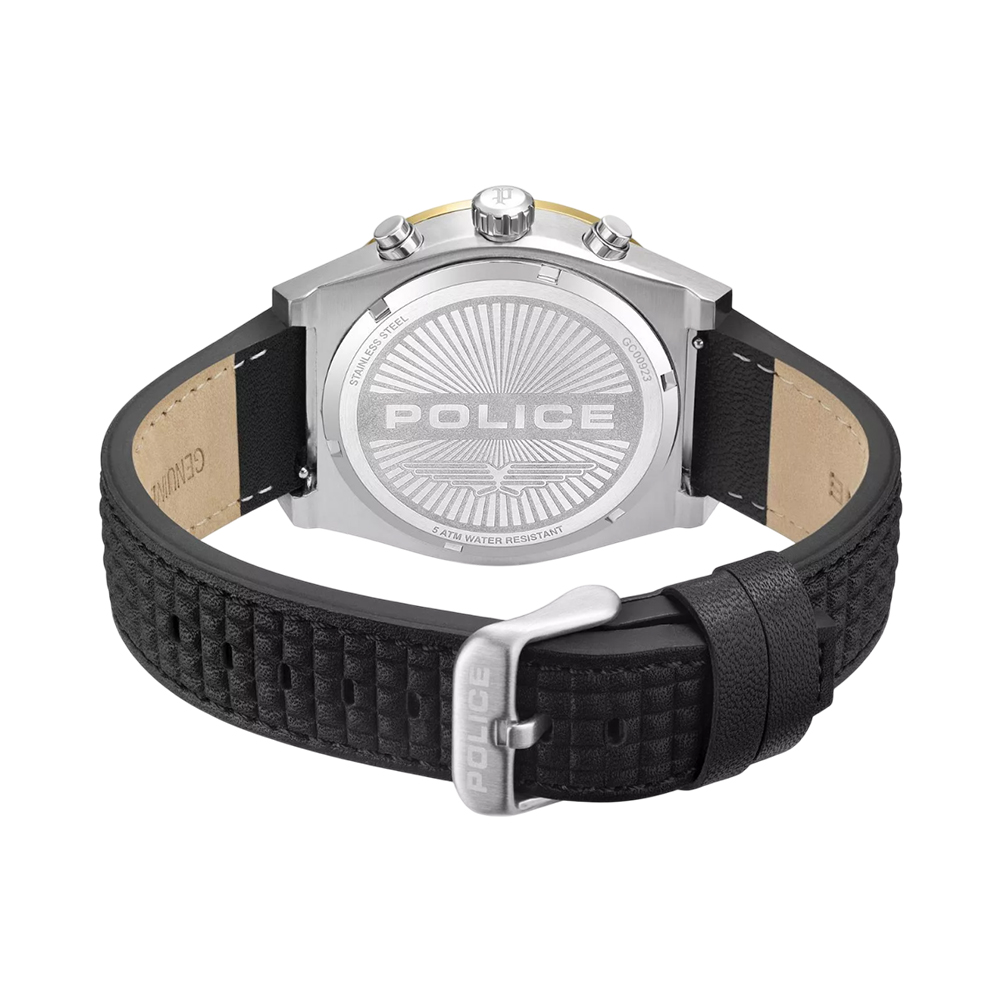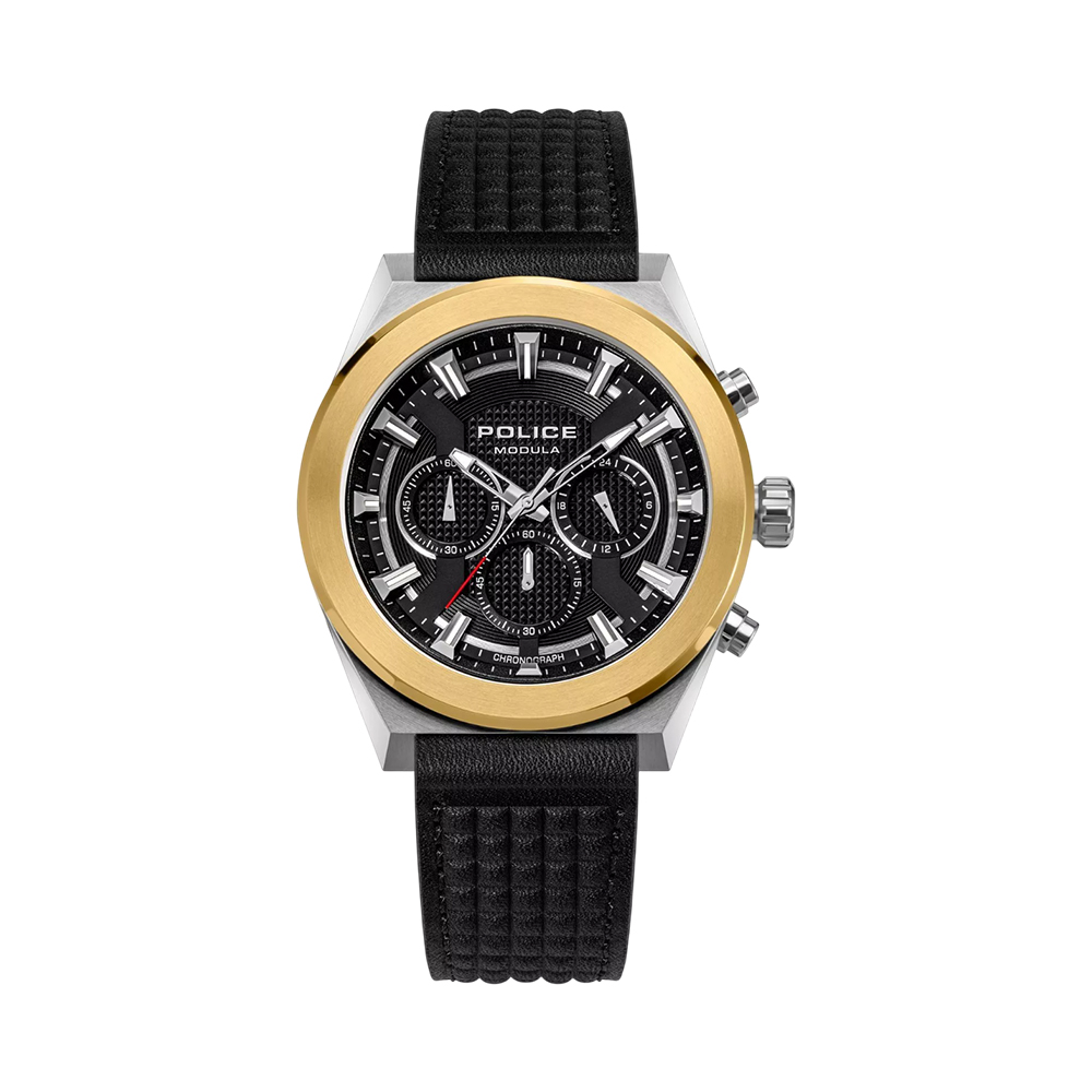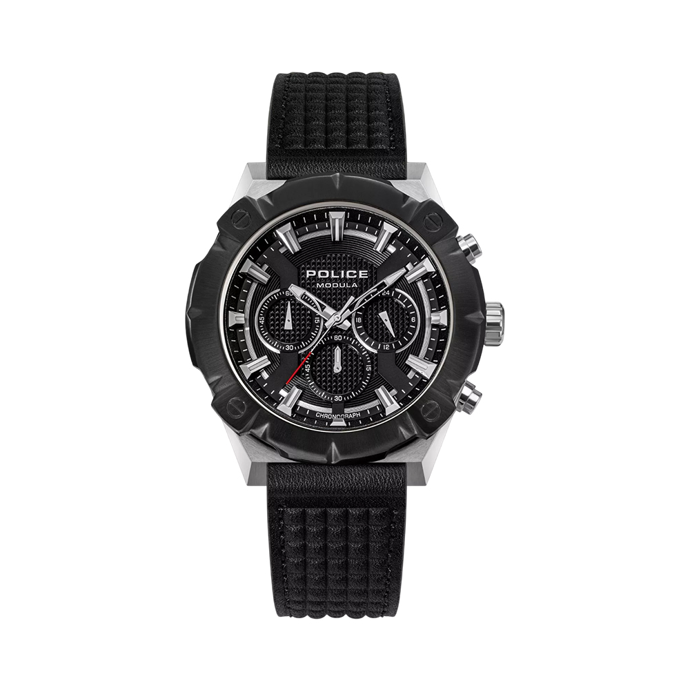 The Police Modula PEWGC00923X0 is a 46 mm customizable chronograph men's watch featuring two strap and bezel options. It offers a leather band, stainless steel case, Seiko quartz movement, and 5 ATM water resistance, ideal for style and function enthusiasts.