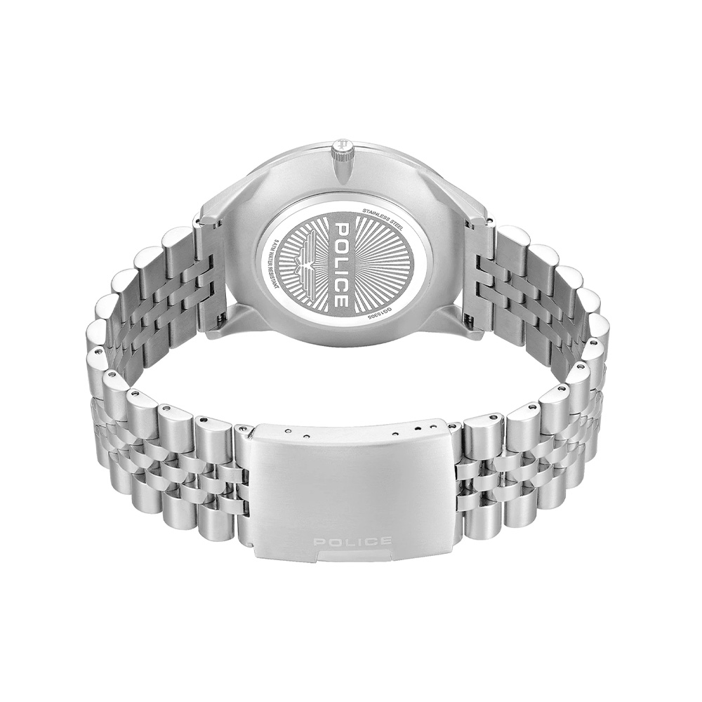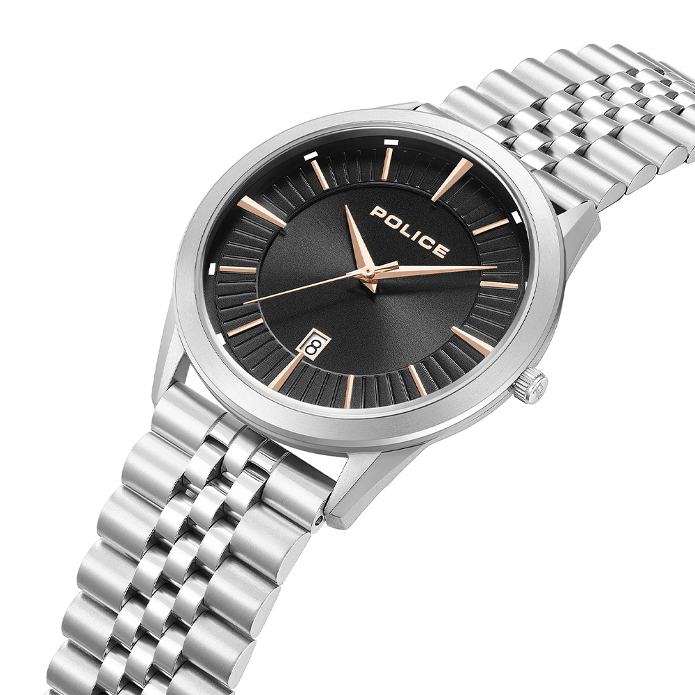 The POLICE Patriot men’s watch PEWGG1530502 is crafted for those who appreciate refined minimalism combined with a confident urban aesthetic. The deep black dial is enhanced with rose gold-tone indexes, creating a striking contrast that offers both sophistication and excellent readability. Encased in a 44 mm stainless steel case, the watch delivers a balanced and modern wrist presence suitable for everyday and formal wear. The matching stainless steel bracelet ensures durability and a seamless, premium finish, enhancing the overall cohesive design. Equipped with a three-hand display and a practical date function at the 6 o’clock position, it combines simplicity with functionality. Protected by mineral glass, the dial maintains clarity while resisting everyday scratches. Powered by reliable quartz movement, it ensures accurate timekeeping, while 5 ATM water resistance protects against splashes and light moisture exposure. A perfect blend of minimal design, durability, and contemporary style.