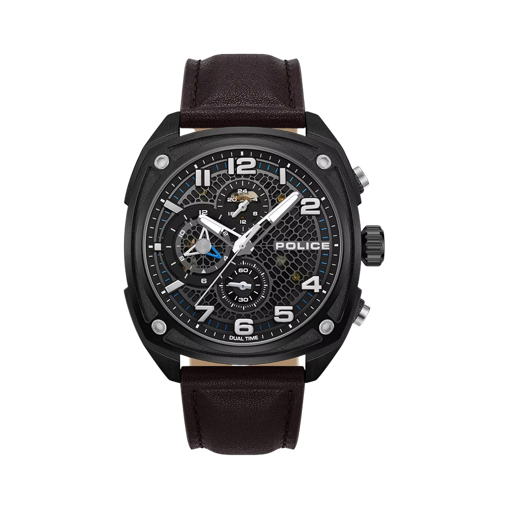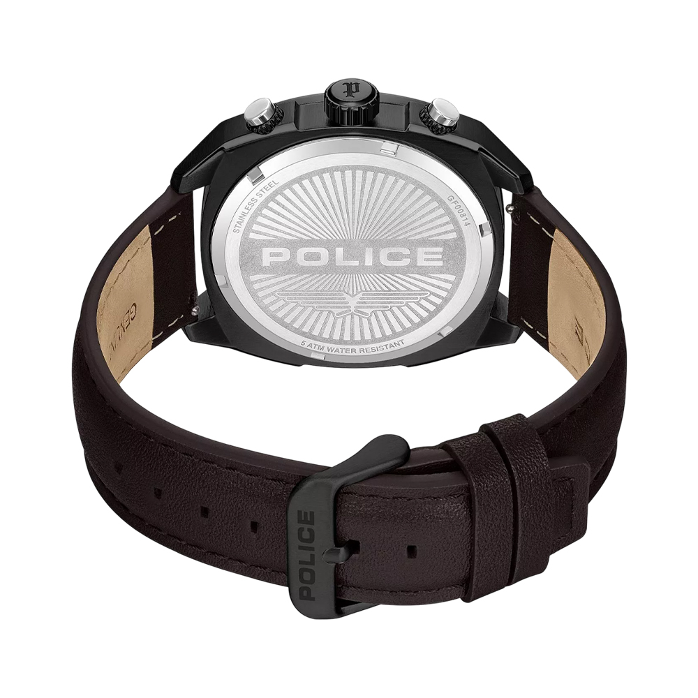 Police Portland PEWGF00814X2 is a multifunction watch for men featuring a 44.5mm stainless steel case with a brown leather and blue silicone strap. Powered by a quartz movement, it offers 5 ATM water resistance and a unique brown/blue dial with multifunction features.