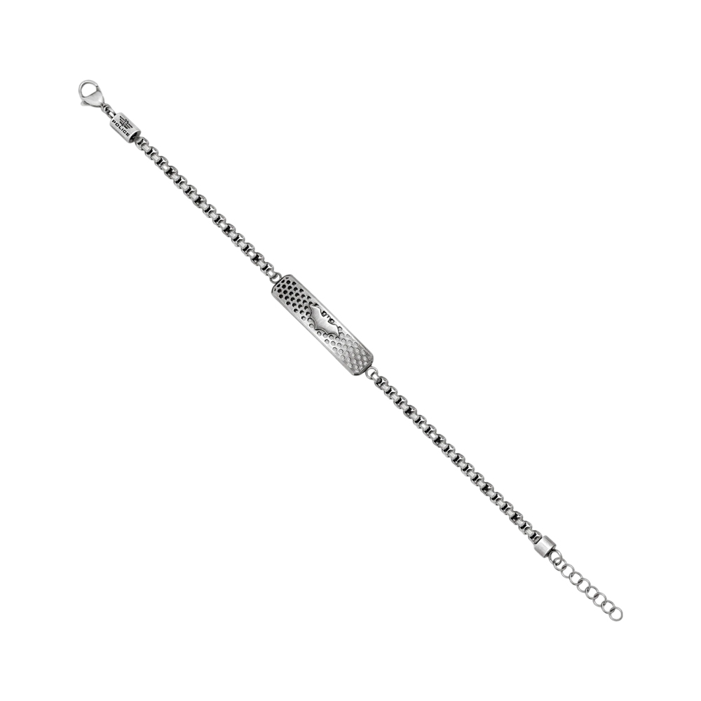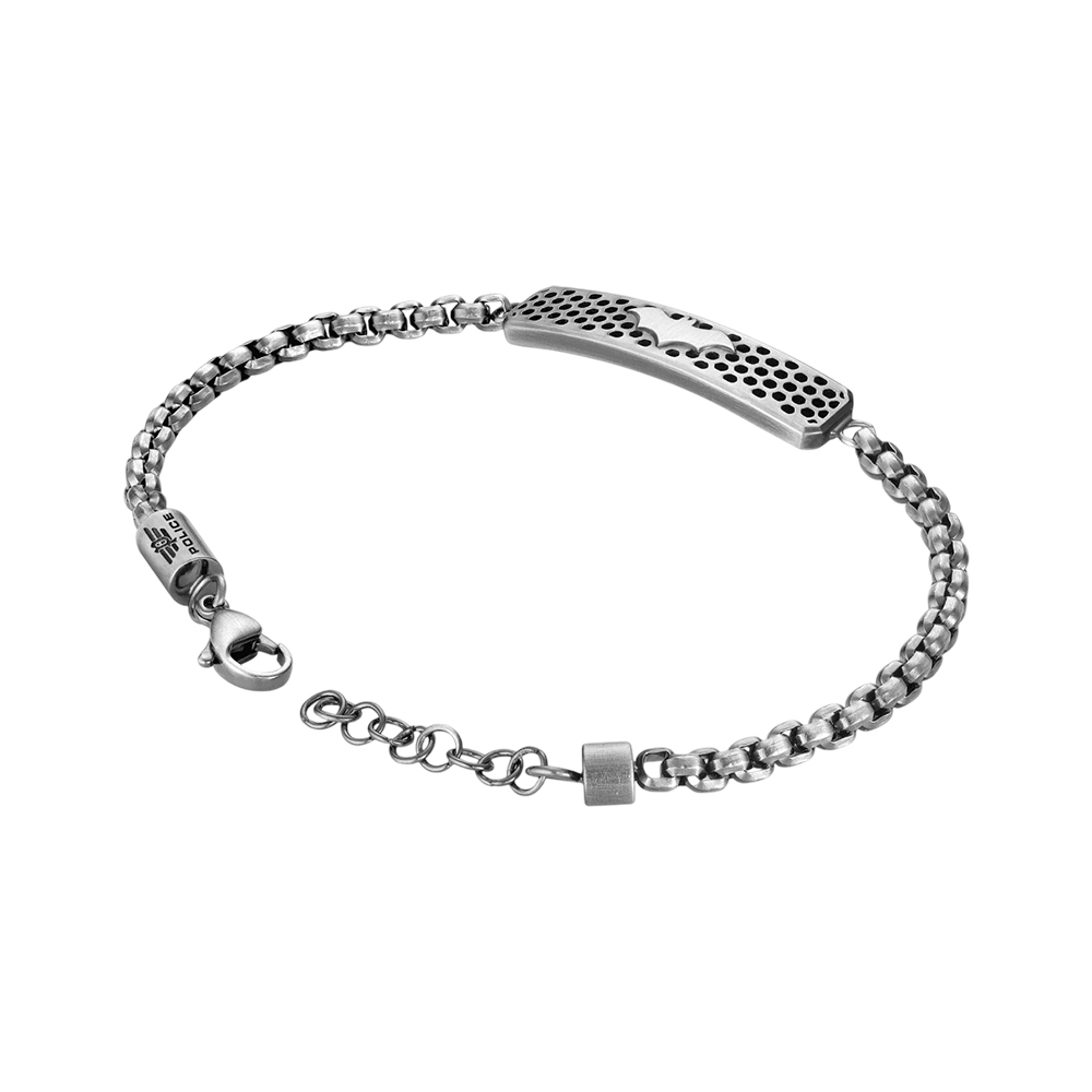 The PEAGB0042101 is a men's bracelet from Police named "Protector." It features an antique silver finish with a bold Batman motif on the plaque, symbolizing strength and defiance. Crafted from durable metal, the bracelet measures 185 mm by 25 mm, designed for those who embody raw determination and never back down.