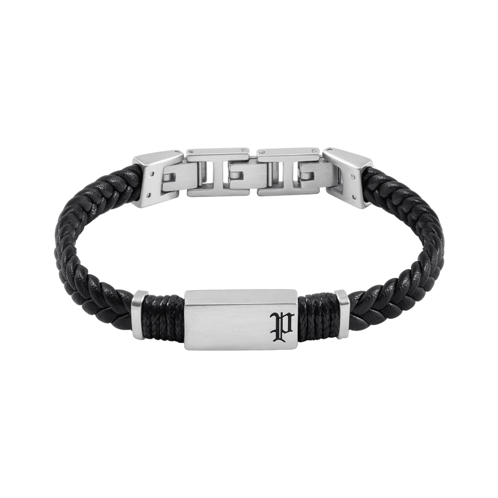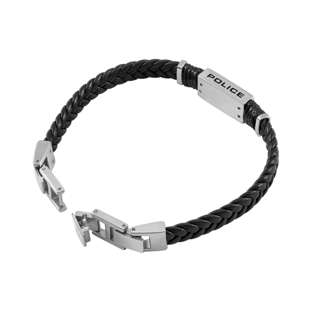 The PEAGB0079503 is a men's Ridgecord bracelet by Police featuring tightly braided flat black leather with a polished silver-tone plaque displaying the iconic Police "P" logo. It measures approximately 205 mm in length (including 2 removable links for size adjustment) and 7 mm in width. The bracelet combines classic craftsmanship with contemporary style for a versatile and stylish accessory.
