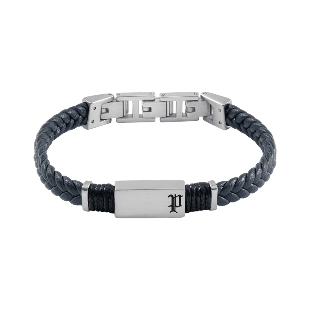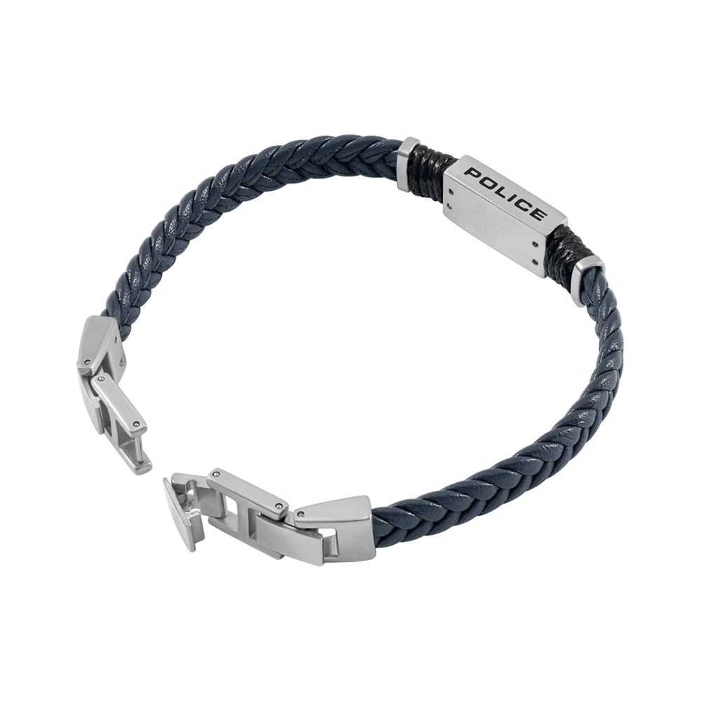 The PEAGB0079501 is a men's Ridgecord bracelet by Police. It features tightly braided flat leather in a striking blue color, accented by a polished plaque engraved with the iconic Police "P" logo. The bracelet measures 190 mm and combines classic design elements with modern, contemporary style.