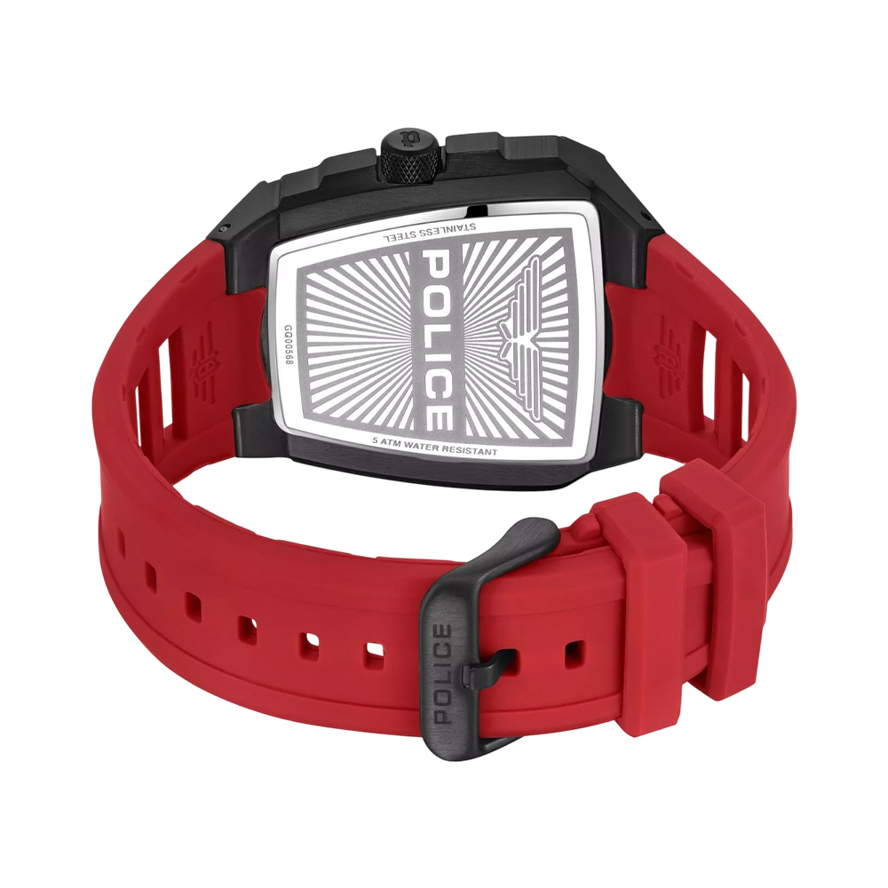 The Police Tough Gear KL Rahul Edition multifunction watch (PEWGQ0056803) is a modern timepiece for men, featuring a black multifunction dial with red accents and mineral glass. It has a black stainless steel case, a red silicone strap, and is water-resistant up to 50 meters. The watch is powered by a quartz movement, has a tonneau-shaped dial, and a tang buckle closure.