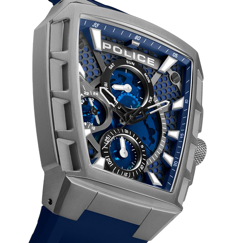 Tough Gear doesn’t follow - it carves its own path. The 46x52mm watch brings a distinct build with sharp edges and polished finishes that oozes audacity. The black and navy dial is detailed with a honeycomb texture and contrast indexes, layered to add depth and grit. Housed beneath a curved mineral glass and finished with a navy silicone strap, this multifunction machine is a piece of engineered defiance, designed for those who don’t flinch under pressure.