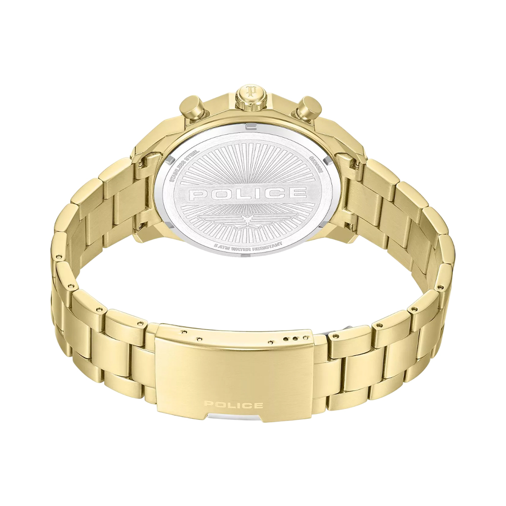 The POLICE Reactor watch features a 46x52.5mm ion-plated gold stainless steel case, a multifunction deep matte black dial with gold-plated indexes, and a solid gold-plated metal bracelet. It offers quartz movement, mineral glass protection, and is built for everyday reliability with a sophisticated look that elevates any outfit.