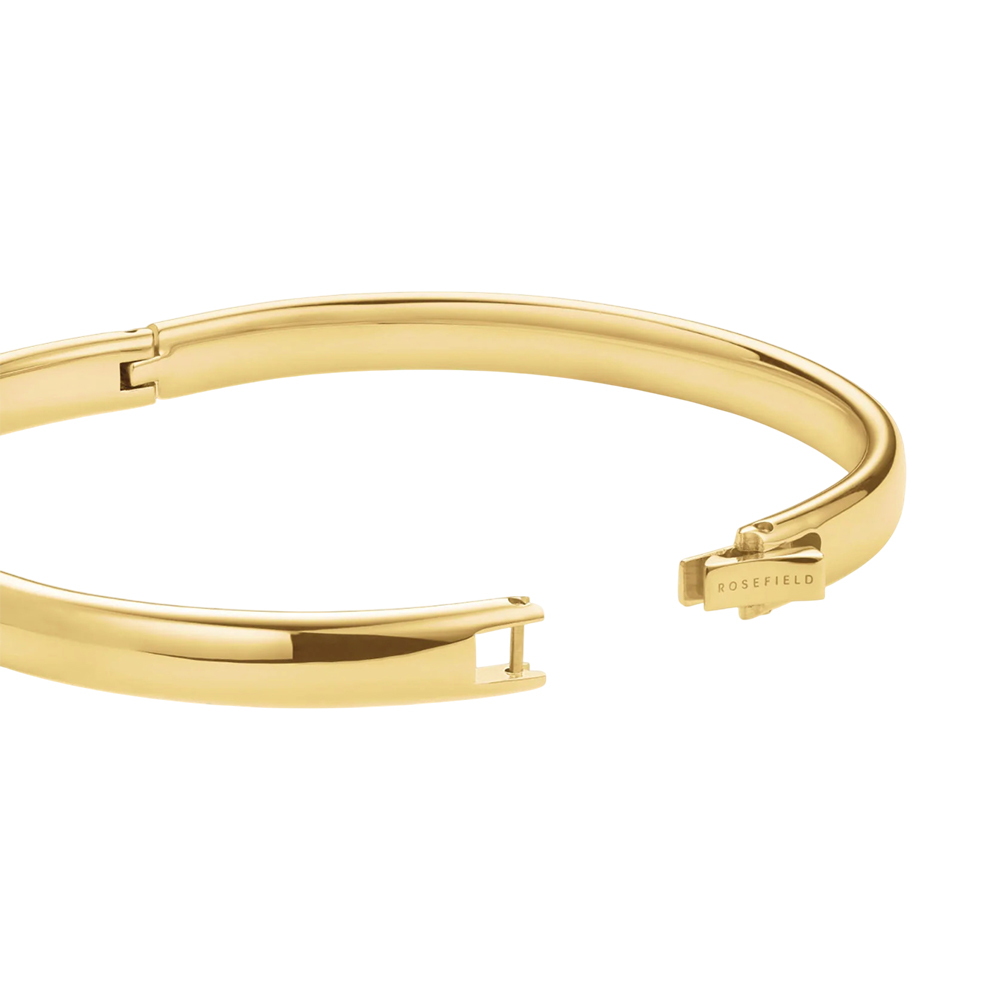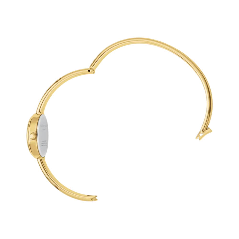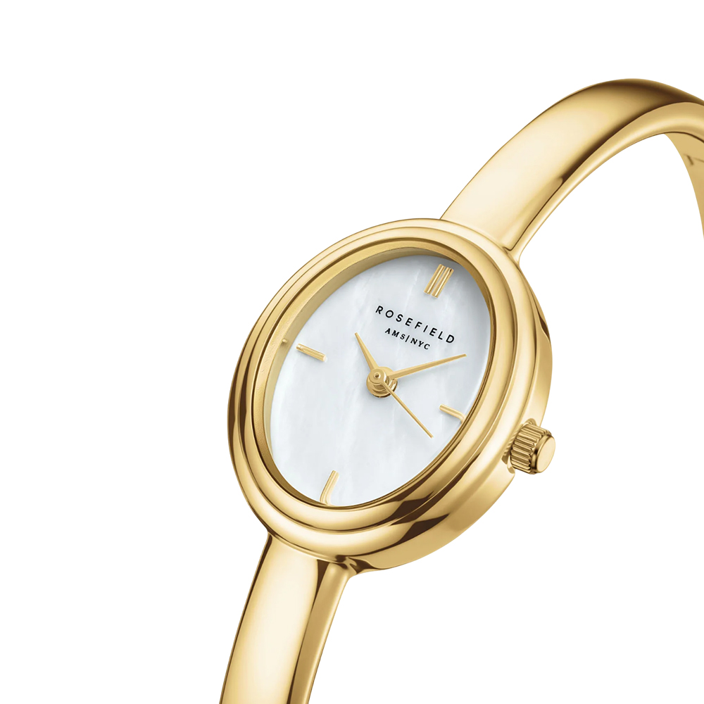 A stylish oval bangle watch from Rosefield's Studio Edition. The gold-plated stainless steel bangle bracelet and case are complemented by a white mother-of-pearl dial. Powered by a quartz movement, it features a snap buckle clasp and is water-resistant up to 3 ATM, making it a fashionable accessory for women.