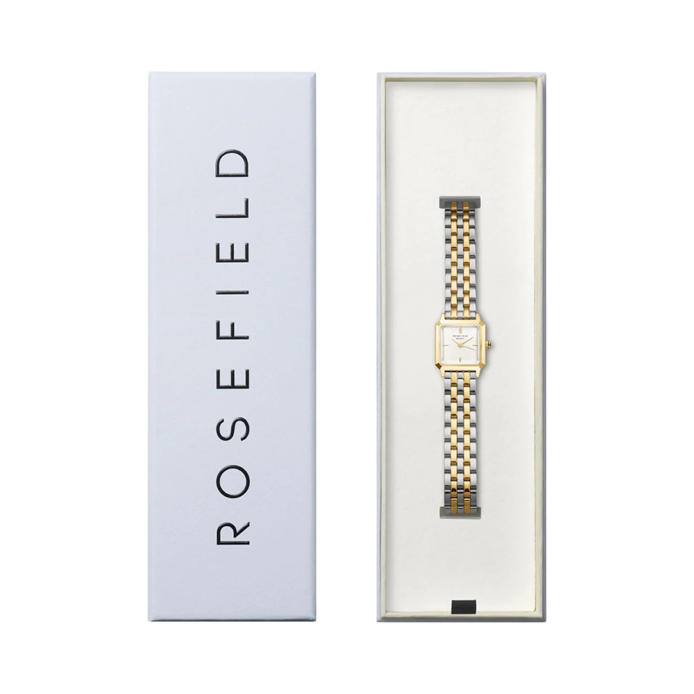 This elegant watch from the Boxelle collection combines classic luxury with modern geometric design. It features a minimalist white matte dial housed in a 7mm thin brass gold case. The high-quality strap is crafted from 23K gold and rhodium-plated stainless steel, offering a seamless duotone aesthetic. Engineered with a precision quartz movement and 3 ATM water resistance, this watch is a versatile accessory that fits interchangeable straps from the Small Edit and Octagon XS collections.