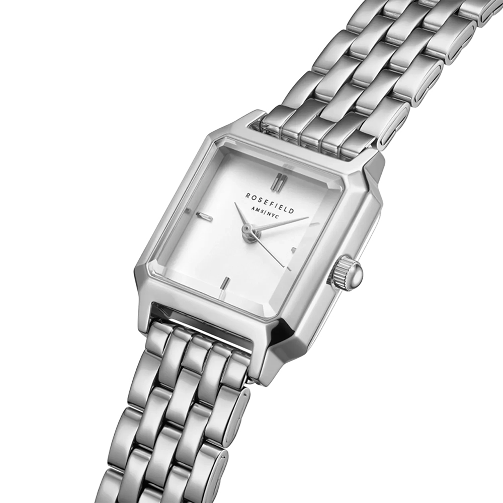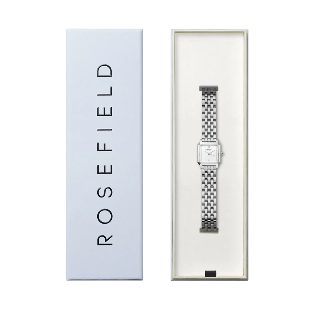 The ROSEFIELD Boxelle Watch BWSSS-B02 blends Dutch minimalism with contemporary New York fashion. This elegant timepiece features a 19 mm square stainless steel case with rounded edges, framing a clean white dial with slender hands. Driven by a precise quartz movement, it is paired with a matching silver stainless steel bracelet featuring rectangular links and a secure fold-over clasp. With its slim profile and 3 ATM water resistance, this watch is a versatile accessory designed for the modern woman who values timeless style and high-quality craftsmanship.