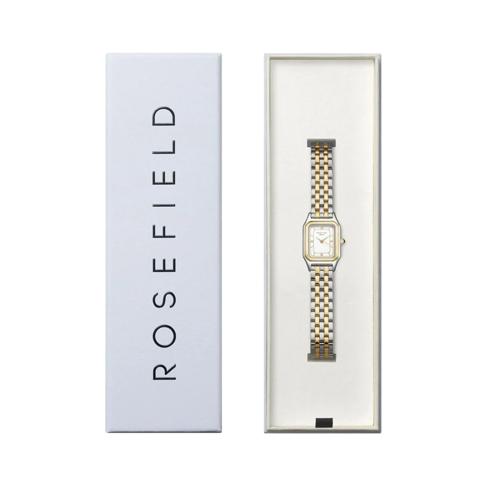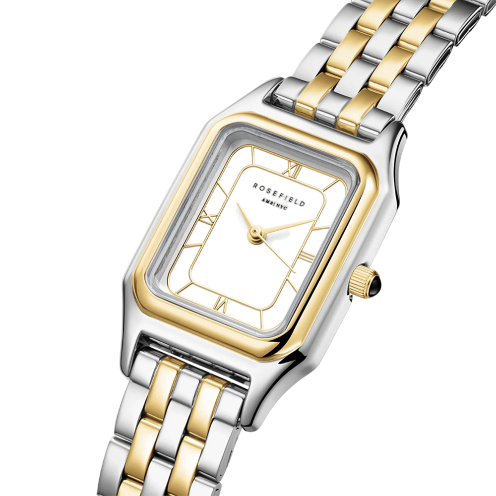 Discover a refined blend of vintage charm and modern sophistication with the Rosefield Ivy women's watch. The distinctive octagonal 21 x 26mm duotone brass case frames a crisp white matte dial, adorned with gold Roman numerals and subtle bar indexes for an elevated, heritage-inspired look. A Swarovski crystal set into the crown lends a discreet touch of luxury while the 23k gold-plated and stainless steel bracelet radiates timeless elegance. Finished with an easy-adjust jewelry clasp, Ivy delivers comfort and enduring style, making it the perfect accessory for everyday sophistication.