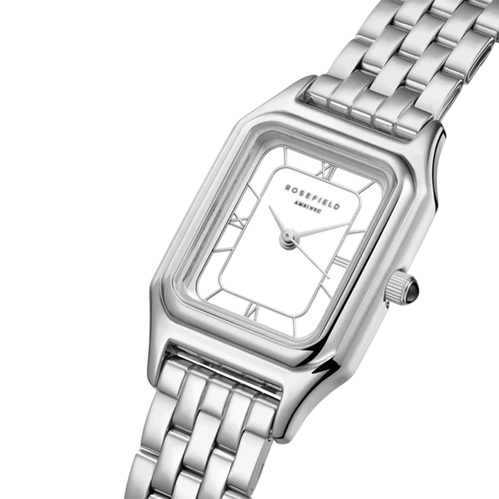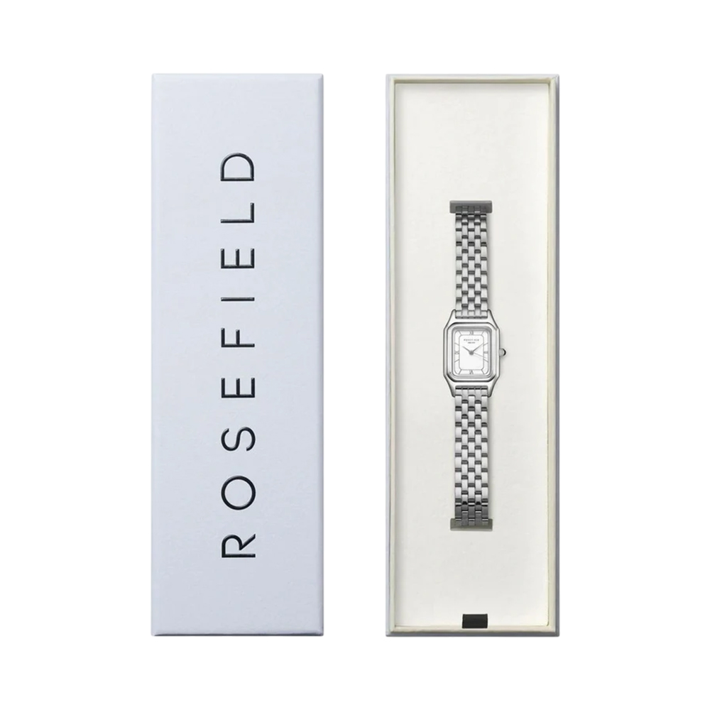 The Rosefield Ivy White Silver watch stands out with its octagonal silver-tone brass case and a crisp white matte dial framed by refined silver Roman numerals. Sparkling with a discreet black Swarovski crystal in the crown, this women's watch combines vintage inspiration with contemporary minimalism. A polished silver-tone stainless steel bracelet and easy-adjust jewellery clasp provide both comfort and a premium feel, while mineral glass and splashproof water resistance ensure lasting durability. Blending heritage elegance with modern design, this timepiece from Rosefield is the perfect finishing touch for everyday sophistication.