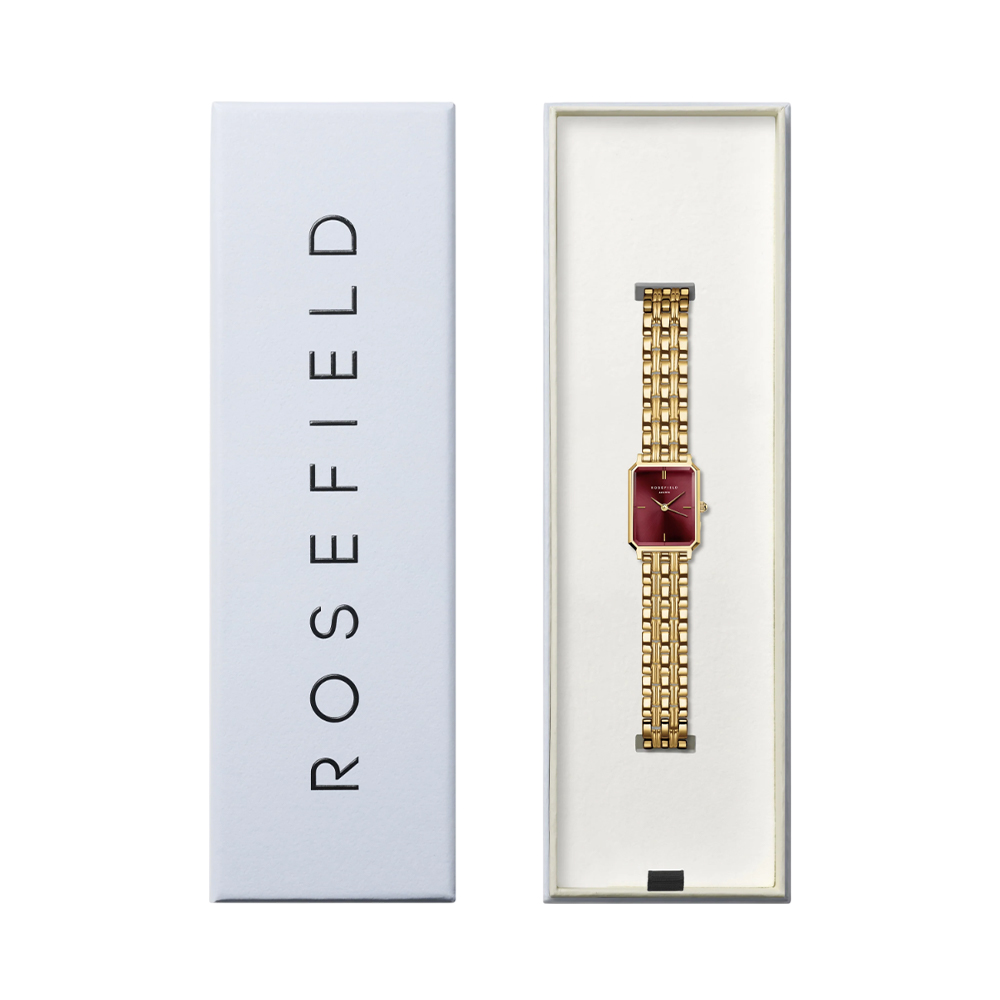 The ROSEFIELD Octagon XS Watch OBGSG-O83 is a masterwork of delicate design, perfectly sized for smaller wrists. This 24 mm timepiece features a unique 19.5 x 24 mm octagonal case with a luxurious 23K gold-plated finish. The deep burgundy dial is shielded by 3D-facet polished glass, adding a brilliant architectural depth and a pop of sophisticated color to the face. Paired with an elegant 5-link gold-plated stainless steel strap, this watch offers a classic yet modern feel. With a 7 mm thickness and 3 ATM water resistance, it is a durable and radiant accessory for the sophisticated woman.