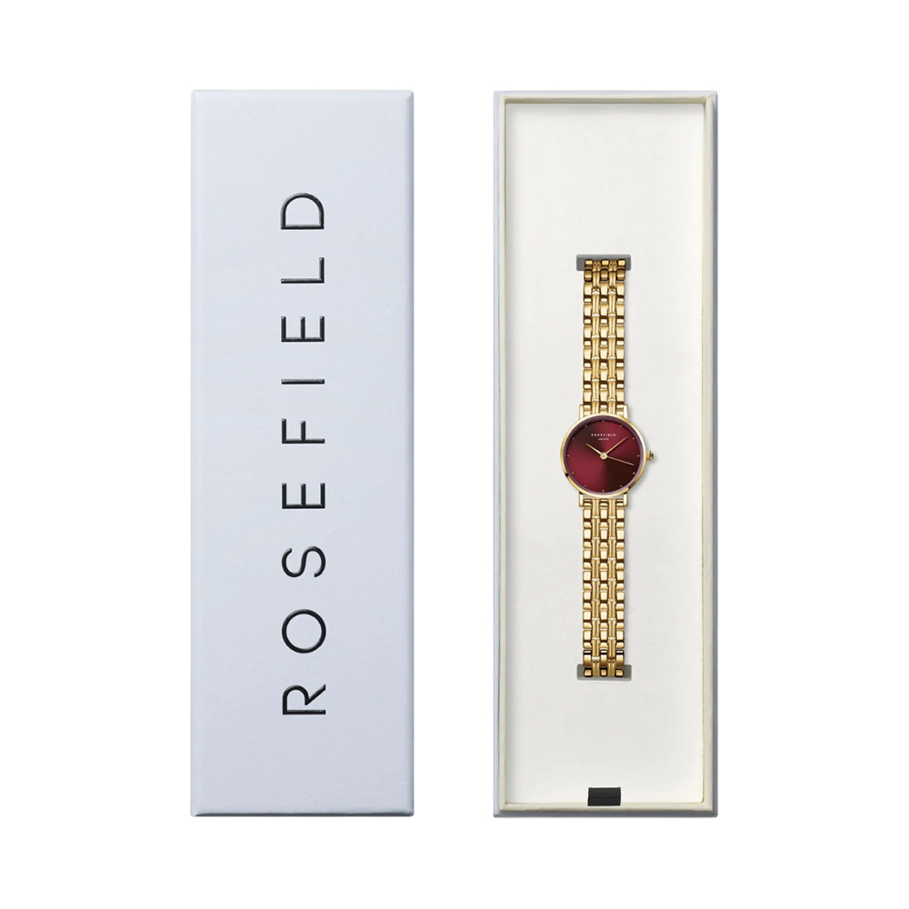 The ROSEFIELD Small Edit Watch SEGSG-SE01 is a refined timepiece designed for those who appreciate understated elegance. It features a compact 26 mm round brass case that frames a striking burgundy analog dial. The watch is complemented by a sophisticated stainless steel and gold-plated bracelet, blending silver and gold tones for a versatile look. Powered by a reliable quartz movement and offering 3 ATM water resistance, this slim and stylish watch is an ideal everyday accessory for the modern woman who values classic design in a petite silhouette.