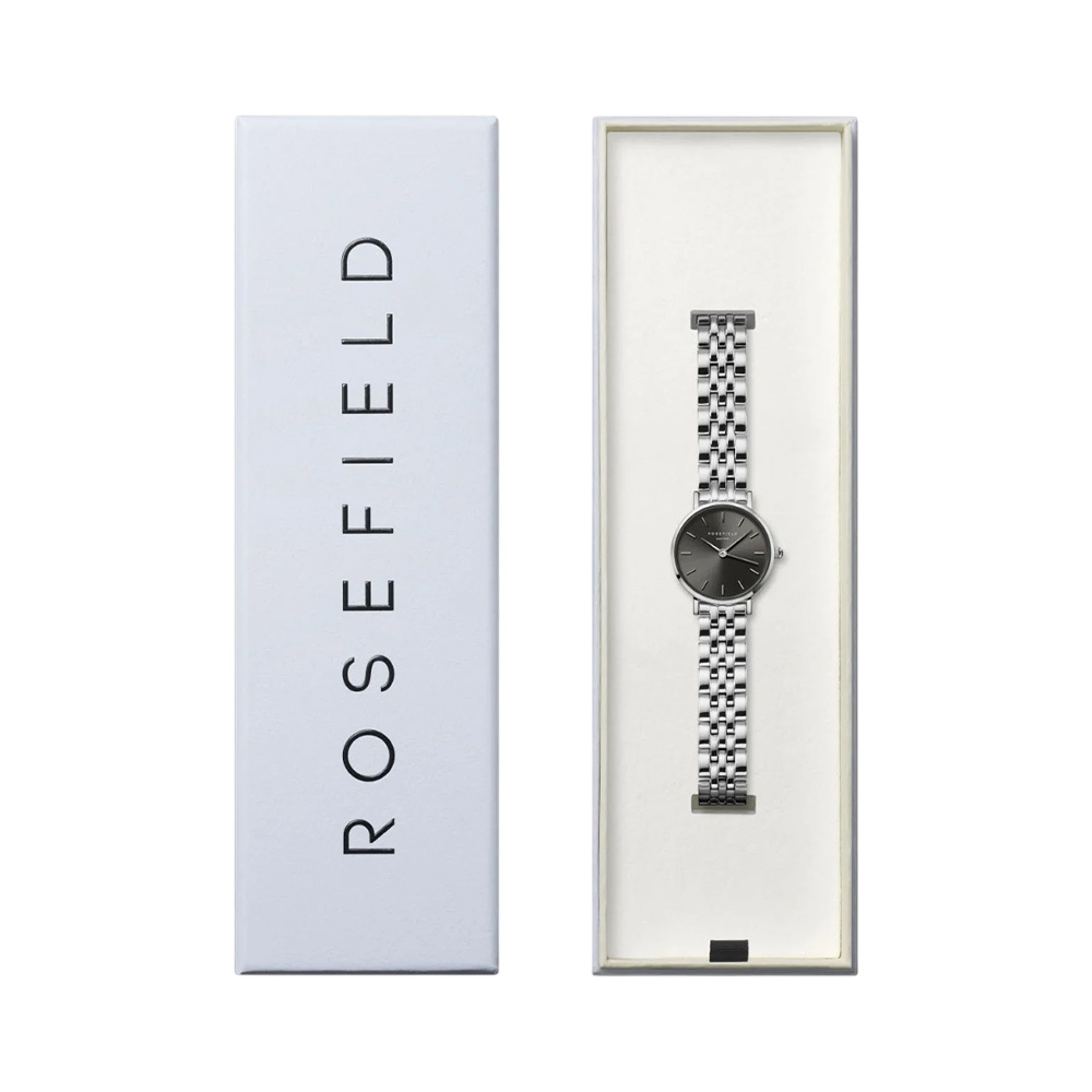 The ROSEFIELD Small Edit Watch SGSSS-SE03 reinvents classic style for a new era, offering one of the brand's smallest and most delicate designs. It features a compact 26 mm round brass case with a polished silver finish, framing a captivating grey sunray dial. The comfortable silver rhodium-plated stainless steel strap is interchangeable, allowing for versatile styling options. With a slim 6.5 mm profile and 3 ATM water resistance, this watch is a durable and stylish everyday accessory for the modern woman who values understated elegance.