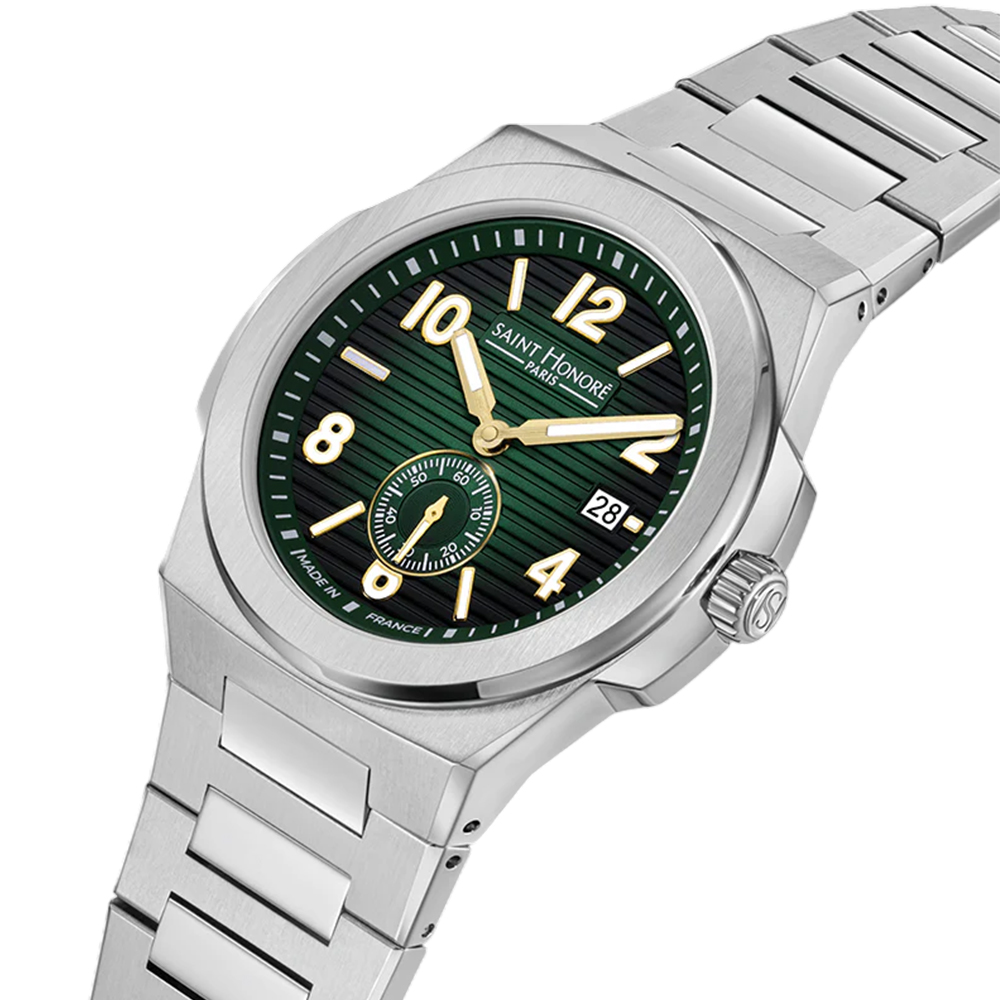 The SAINT HONORE Bercy Men Watch BC862101 1VIT is a sophisticated expression of French horology, blending classic heritage with a contemporary edge. It features a robust 43 mm stainless steel case and integrated bracelet, framing a captivating textured green dial adorned with gold-tone hands and markers. A subtle small-seconds sub-dial at 6 o'clock adds visual balance, while the scratch-resistant sapphire crystal ensures lasting clarity. Powered by a high-precision quartz movement and offering 5 ATM water resistance, this timepiece from the Bercy Collection brings refined confidence and durable elegance to the modern gentleman's daily attire.