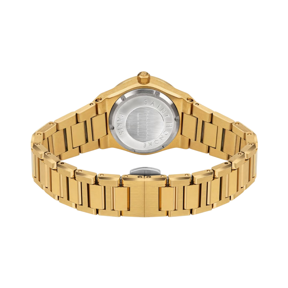 A fashionable women's analog watch from the Saint Honore Haussman Lady collection. It features a gold-toned stainless steel strap, a matching case, and a green round dial with minimalist hands. The watch is powered by a quartz movement and offers 30m water resistance.