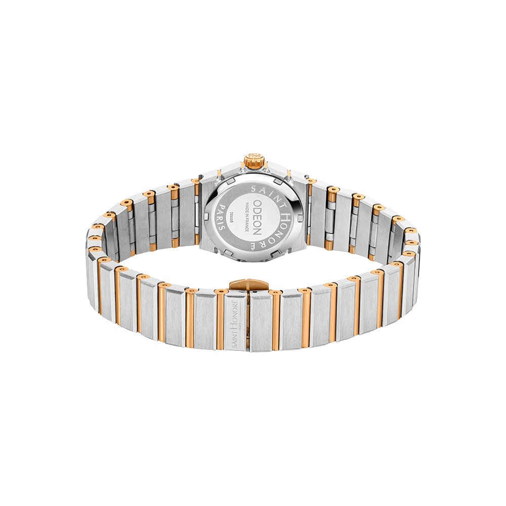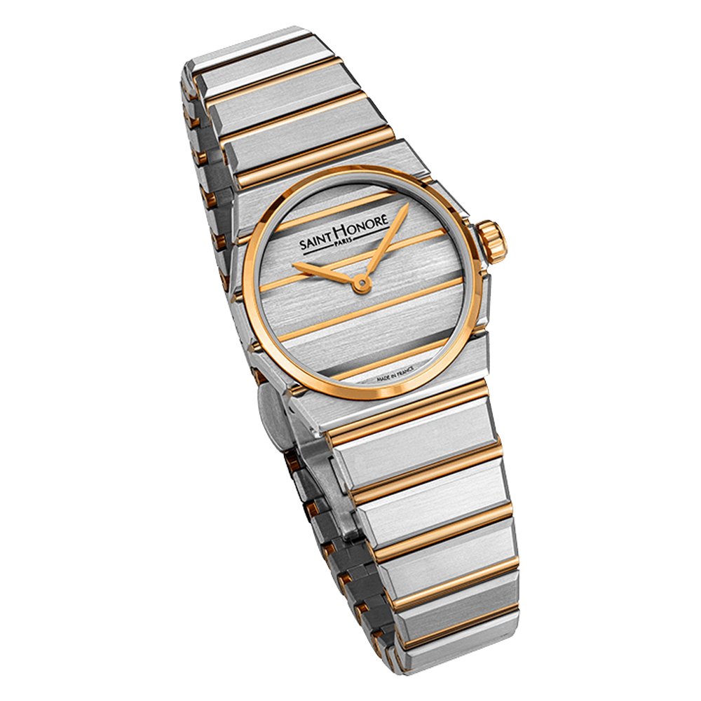 Lending a contemporary twist to an elegant design, this women analog watch from the collection by Saint Honore Paris is a must have wrist essential. The rose gold round dial is protected by a mineral glass. It features and a crown for time adjustment. The stainless steel strap comes in a two tone hue that further elevates the look of the timekeeper. Besides, it is completed with a fold over clasp with double push button safety clasp to ensure a secure fit on the wrist.